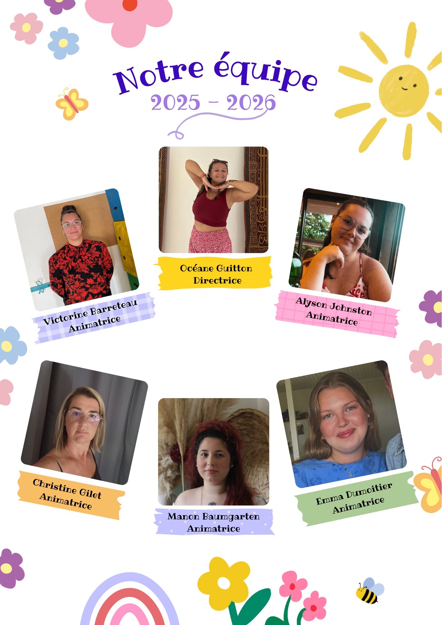 Océane : Directrice dynamique et à l’écoute, elle coordonne l’équipe et veille au bien‑être de chaque enfant.
